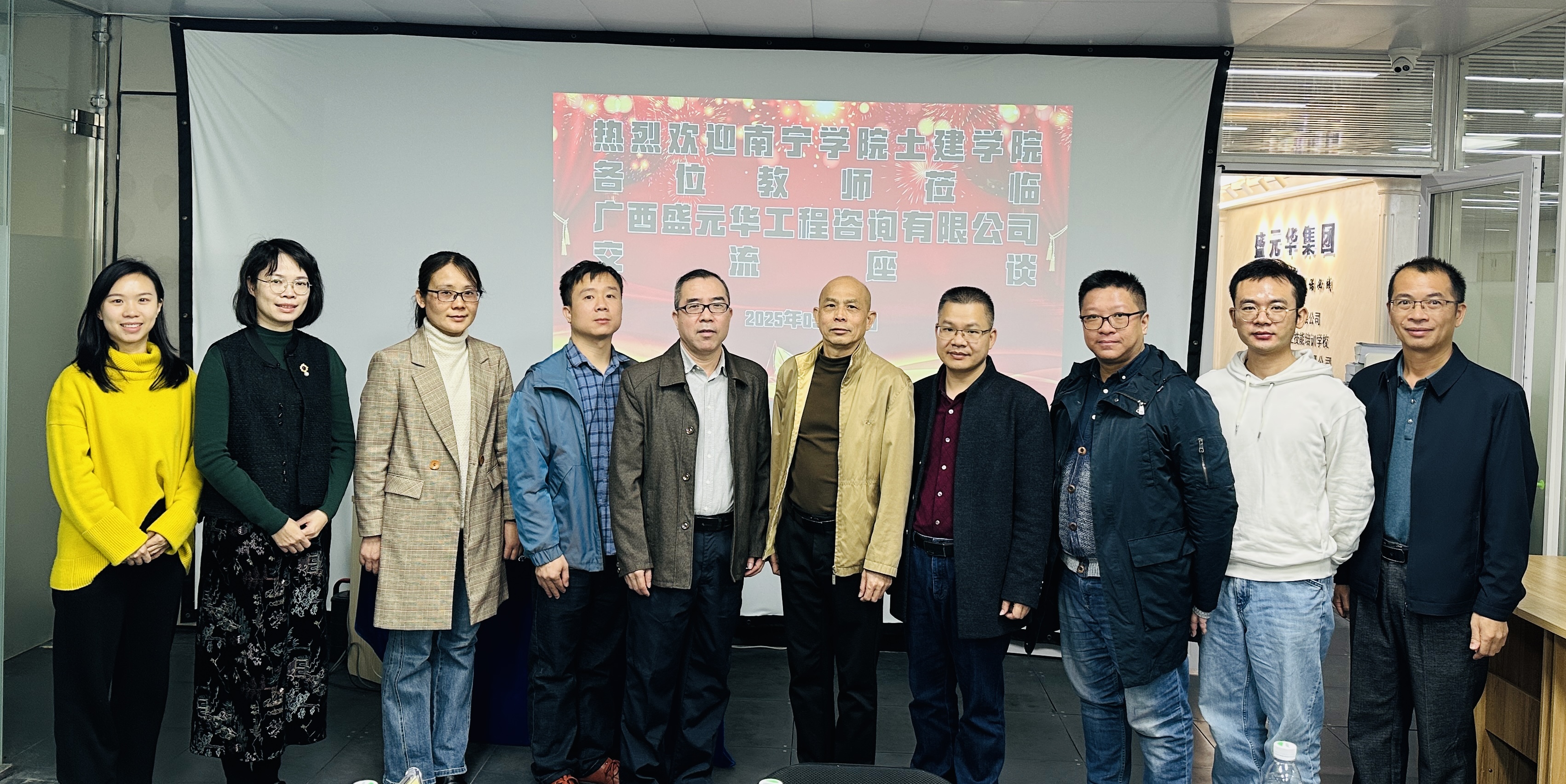 3月19日上午,南寧學(xué)院土木建設(shè)工程學(xué)院教工支部書記楊劍、副院長助理陶月平、工程造價專業(yè)專任教師孔德輔、韋麗、李欣欣一行蒞臨廣西盛元華集團(tuán)總部開展交流活動。